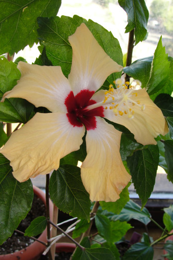 Acest hibi a facut si floare somon dar acum a facut o floare rosie, de aceea am spus ca trebuia sa fie somon !